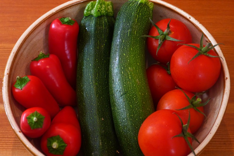 For my version of the dish, I used baby peppers, young courgettes and medium-sized vine tomatoes.  Served warm, the courgettes and peppers would make great canapés, the tomatoes would work better as a light lunch dish, with a green salad, as finger food they are not.  Bon appetit!