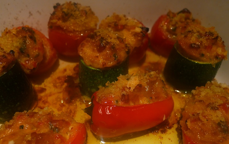 Fill the hollowed vegetables with the mixture, sprinkle with the remaining breadcrumbs and drizzle with olive oil before placing in the pre-heated oven for 20-25 minutes uncovered.  The tops of the vegetables should be brown and crispy when you take them out of the oven.  Yummy.