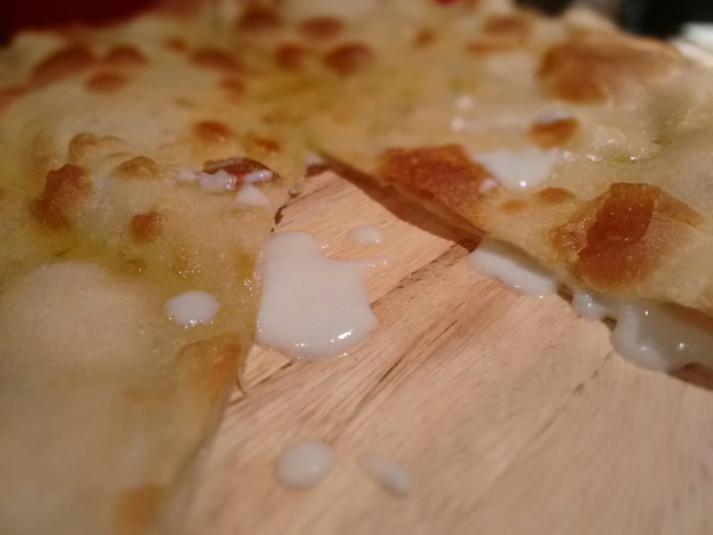 I’ve written about focaccia before but not specifically about cheese focaccia which is something altogether different. We typically think of focaccia as a thick, dimpled yet fluffy bread, dripping in olive oil and crunchy with salt, sometimes garnished with a diverse range of toppings such as olives, onions and/or rosemary. Cheese focaccia on the other hand is a true flatbread. There is no yeast and the dough is rolled out as thinly as possible into two large discs which are then sandwiched together to hide a mouthwatering cheese filling: a filling so gooey and tasty that is difficult to achieve without using chunks of the tangy, fresh Crescenza cheese, a speciality of Northern Italy, made from cow’s milk.